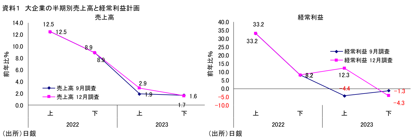 資料1は、12月短観の調査対象大企業(全産業、除く金融)が計画する半期別売上高・経常利益前年比の推移を見たものである。まず売上高を見ると、23年度は下期に限れば下方修正だが、年度全体で見れば上方修正となっている。