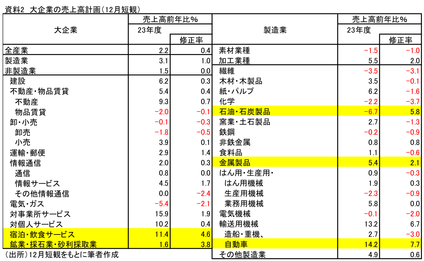 - 12月短観における23年度の大企業収益計画によれば、売上高・経常利益とも上方修正。