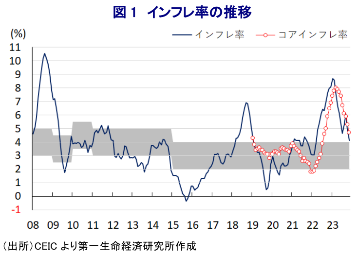 フィリピンでは昨年、コロナ禍の一巡を受けた景気回復の動きに加え、商品高や米ドル高の動きも重なりインフレが大きく上振れする事態に見舞われた。中銀は物価と為替の安定を目的に、昨年5月以降は断続、且つ大幅利上げを余儀なくされる難しい対応を迫られた。昨年末以降は商品高と米ドル高の動きが一巡したほか、中銀による利上げ実施にも拘らずインフレ率は今年1月に約14年ぶりとなる高水準となるなど、物価高と金利高の共存により景気に冷や水を浴びせる懸念が高まった。中銀は年明け以降も一段の利上げを継続する展開が続いたものの、インフレが頭打ちに転じたことで中銀は今年5月に1年に及んだ利上げ局面を休止させるとともに、様子見姿勢を維持した。この背景には、物価高と金利高の共存が家計消費など内需の重石となるのみならず、世界経済の減速懸念が外需の足かせとなるなど、内・外需双方に景気の悪材料が山積していることが影響している。他方、7月に中銀総裁に就任したレモロナ氏は前任であったメダラ氏に比べて『タカ派』姿勢をみせており、総裁就任後は物価安定に向けて政府の政策運営にも注文を付けるとともに、物価安定を重視して再利上げも辞さない考えを示した。こうしたなか、主要産油国による自主減産延長や中東情勢の悪化を理由に原油価格が上振れしたほか、エルニーニョ現象など異常気象を理由とする農作物の生育不良を理由に穀物をはじめとする国際価格も上振れするなど、食料品やエネルギーなど生活必需品を中心とするインフレ懸念が強まる動きがみられる。さらに、商品高を理由に米FRB(連邦準備制度理事会)をはじめとする主要国中銀が一段の利上げに動くとの観測を反映して米ドル高の動きが再燃し、同国では通貨ペソ相場が大きく調整するなど輸入インフレ圧力が強まることが懸念されたため、中銀は10月末に緊急利上げを決定するとともに、状況如何でさらなる利上げも辞さない姿勢を示した(注1)。しかし、その後は食料インフレの懸念は燻ぶる一方、世界経済の減速懸念が高まるなかで原油価格は一転して頭打ちの動きを強めるとともに、米FRBによる利上げ観測が後退したことで米ドル高の動きも一服したため、中銀は先月の定例会合では政策金利を据え置くなど様子見姿勢に転じる動きをみせた(注2)。一方、物価高と金利高の共存状態が長期化しているにも拘らず、7-9月の実質GDP成長率は底入れの動きを強めるなど堅調さがうかがえる状況にある。さらに、足下のインフレは国際原油価格の調整の動きも追い風に一段と頭打ちの動きを強めているほか、先月以降は米FRBによる利下げが意識されるなかで一転して米ドル安が進むなど、インフレ鈍化に繋がる動きもみられる。こうしたことから、中銀は14日に開催した定例会合において政策金利である翌日物リバースレポ金利を2会合連続で6.50%に据え置く決定を行うなど、様子見姿勢を維持している。会合後に公表した声明文では、インフレを巡るリスクについて「上向きに傾いている」との認識を示す一方、「中期的な景気見通しは依然として堅固である」、「インフレ期待は幅広くしっかりと固定化されている」との見方を示している。その上で、政策運営について「引き続き引き締め姿勢を維持することが必要と考えている」との見方を示すとともに、「必要に応じて調整する用意はある」とするなど再々利上げに含みを持たせる考えをみせている。また、先行きのインフレ見通しについて「来年1-3月に目標域に回帰した後、4-6月には再び加速するも7-9月には再び目標域に回帰し、10-12月には目標域の中央値付近に留まる」とした上で、「依然としてインフレ抑制が焦点となる」としてインフレ抑制に引き続き注力する考えを示している。中銀は再々利上げに含みを持たせる姿勢をみせているものの、食料品を除けばインフレ懸念に繋がる材料が後退していることを勘案すれば、当面は様子見姿勢を維持する可能性は高まっていると判断出来る一方、その行方については外部環境如何の展開が続くであろう。
