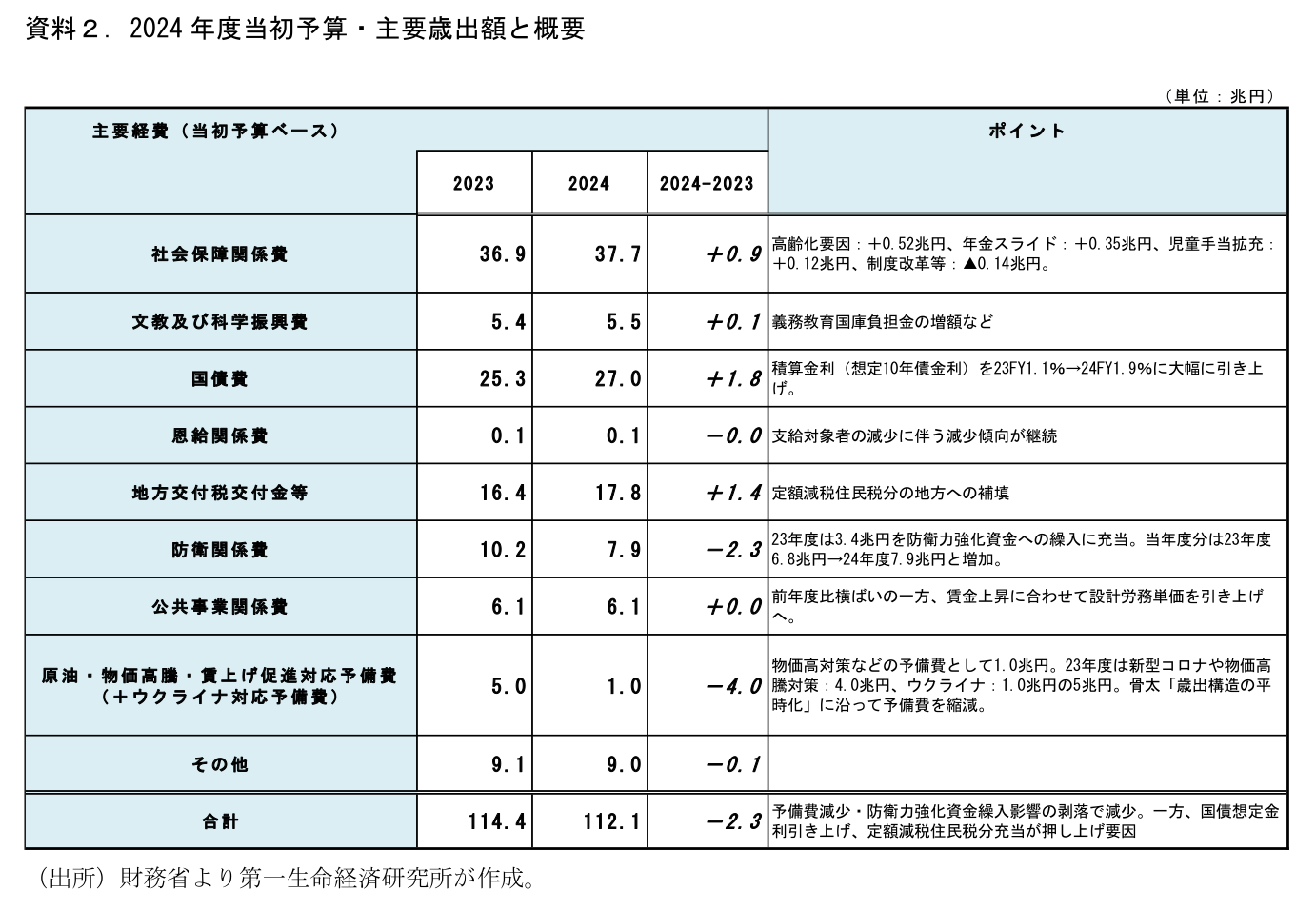- 近年のインフレを歳出額に明示的に織り込んだ様子はなく、文教・科学振興費や公共事業関係費は名目横ばいとなっている。インフレ下では実質歳出額の減少が進んでいることになり、将来的に各省庁からインフレに伴う増額対応を求める声が高まる可能性がある。