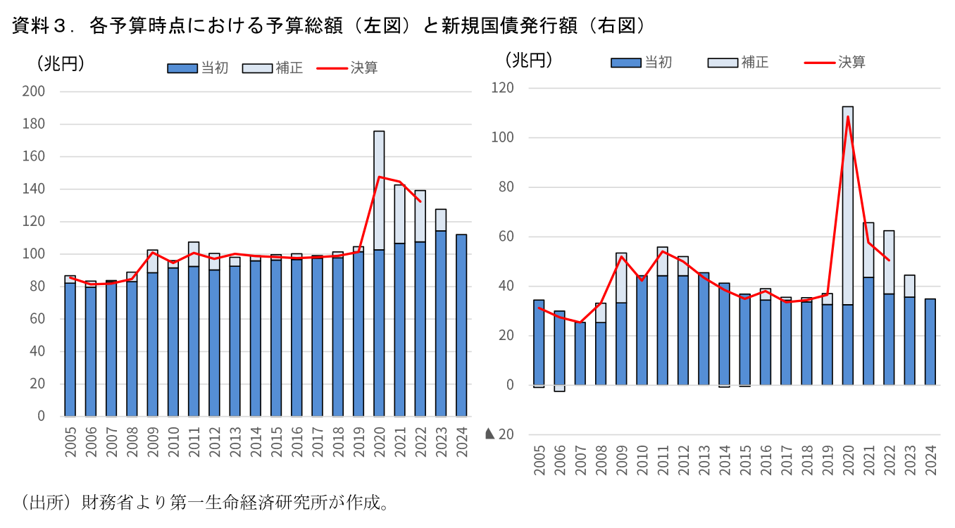 結果として、新規国債発行額は23年度35.6兆円→24年度34.9兆円に減額された。今年の骨太方針ではコロナ禍における財政拡張からの平時化が掲げられていた。定額減税分は新発債の増加要因だが、予備費の縮小などで全体としては減額予算にまとめた形だ。23年度補正予算の額も22年度からは明確に縮小しており、平時化方針の下で歳出額全体は徐々に縮小方向にある(資料3)。