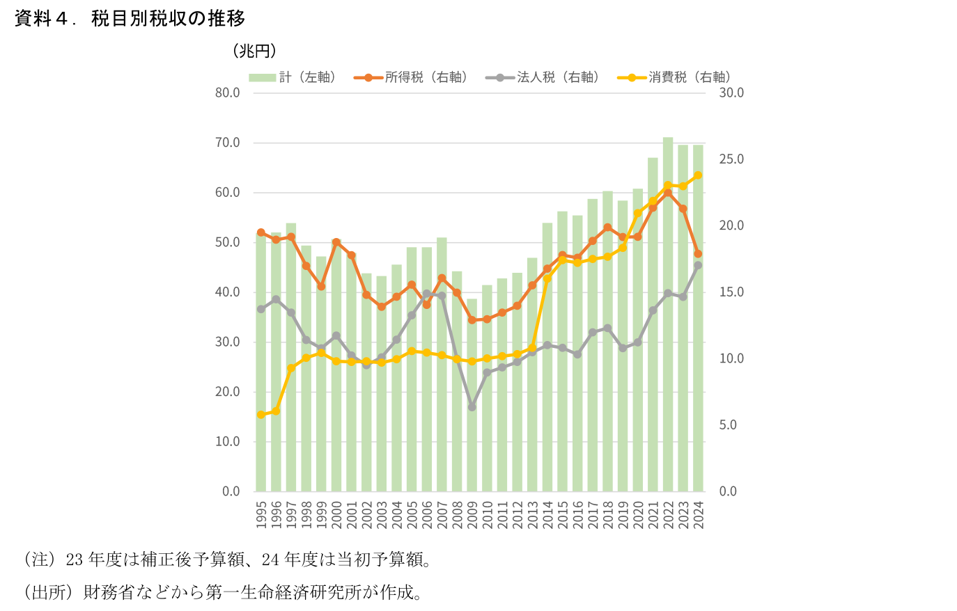 1Economic Trends「なぜ税収は去年より減っているのか?~テクニカル要因だが、23 年度税収の増勢は鈍化へ~」(2023年10月31日)https://www.dlri.co.jp/report/macro/285700.html