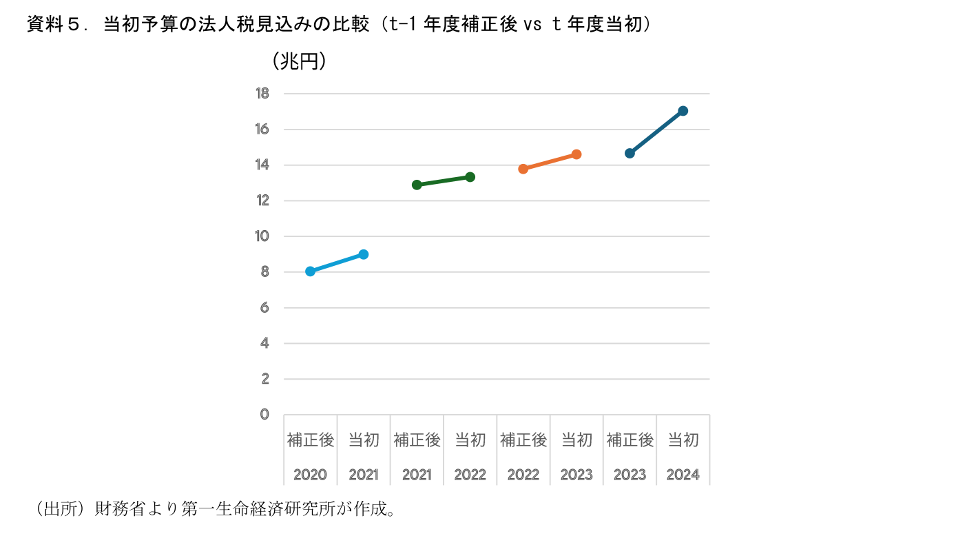 なお、所得税の定額減税規模は政府税制改正大綱の増減収見込みにおいて▲2.3兆円とされており、今回の所得税の減少規模はそれよりも大きい。一方で、かなり強気の見通しになっているのが法人税である。法人税収の見込みは23年度補正後予算時点(実績見込み)で14.7兆円だが、ここから24年度は17.0兆円とプラス2.4兆円の増と想定されている。資料5では同様に年末時点でのt年度の税収見込みとt+1年度の税収見込みを法人税について比較している。過去の予算編成における法人税見込みと比較しても伸びが大きくなっていることがわかる。