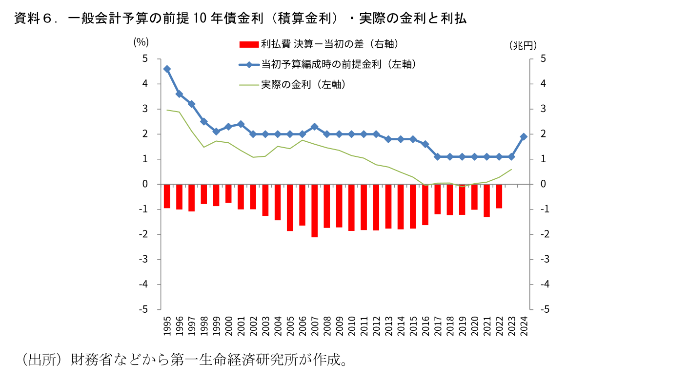 今回予算案では国債費の増加が目立ったが、背景にあるのは予算の前提となる長期金利(積算金利と呼ばれている)の引き上げだ。2017年度予算以降は1.1%で計算がなされてきたが、24年度予算は1.9%とされた。足元の長期金利上昇を勘案したものであり、財務省の数値設定方法が変わったわけではないようだが、引き続き相当なバッファーを持たせた前提ではある。
