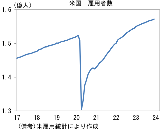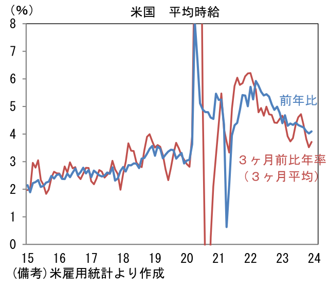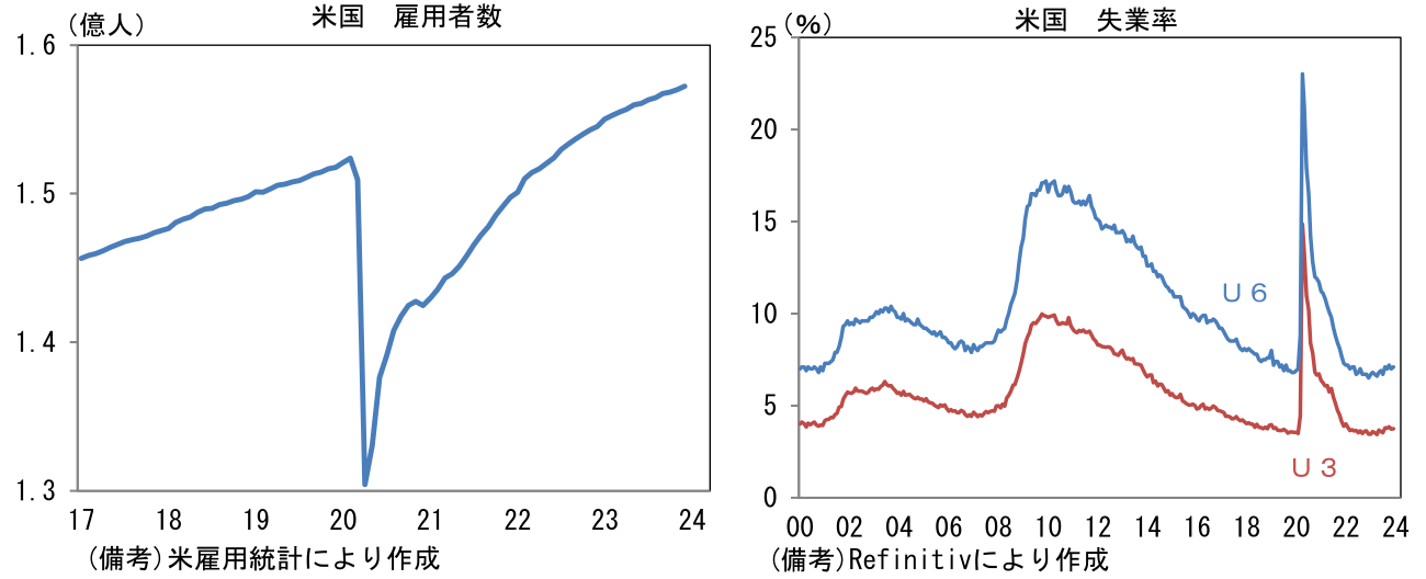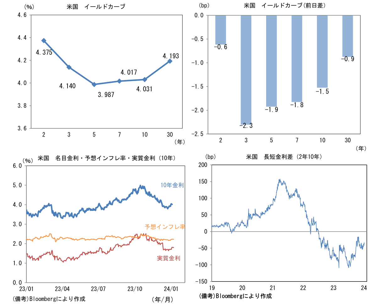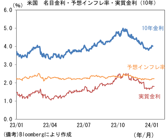 - 12月雇用統計それ自体はFedの利下げを強く促す結果ではなかったが、それでもインフレ率が低下する中、景気への配慮を踏まえれば年央までの利下げ開始の蓋然性は高い。米10年金利は年末までに急低下した反動から短期的に上昇する可能性があるものの、4.5%を上回るような状況は現時点で想定しにくい。