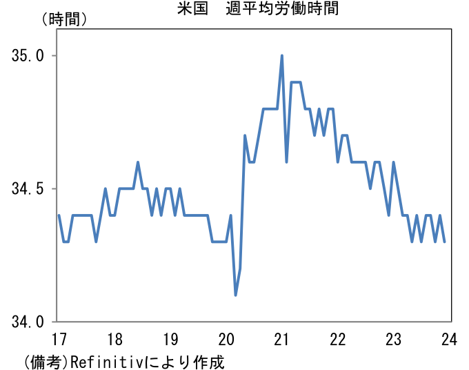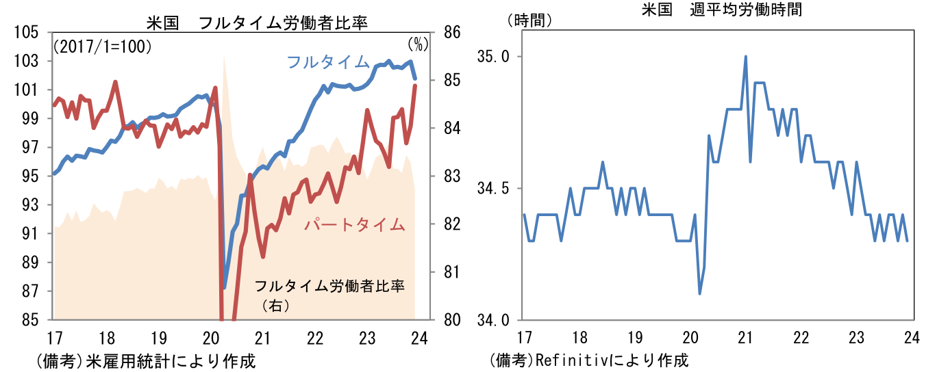 - 雇用者数は前月比+21.6万人と市場予想をやや上回ったものの、過去2ヶ月分が7.1万人下方修正されたことで相殺された。ただし以下の2点を踏まえると、12月雇用統計は見た目よりは弱い。第一にフルタイム労働者の減少がある。雇用増をけん引したのは専らパートタイムであり、企業が固定費増加を伴う雇用増に慎重であることが窺える。第二に、雇用者数の増加が教育・ヘルスケア(+7.4万人)と政府部門(+5.2万人)という景気に敏感でない業種に集中していたことがある。その反面、レジャー・ホスピタリティと小売はそれぞれ+4.0万人、+1.7万人に留まり、運輸は▲2.3万人、その他サービスは▲0.0万人と減少した。雇用者数増加それ自体はいかなる業種であろうとマクロ的には所得増加を意味するため好感すべきだが、人手不足に対応するための積極的に人員を確保するという異質な局面は終焉している。そうした下で週平均労働は34.3時間へと短縮化した。
