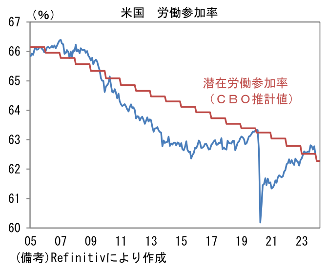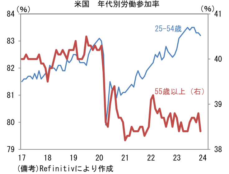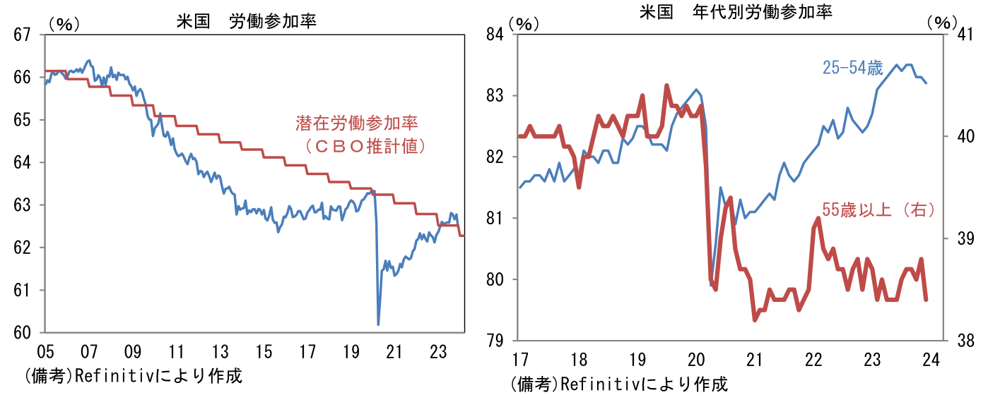 労働市場の厚みを示す労働参加率は62.48%(11月62.78%)へと低下。パンデミック発生以降の最高値であった11月から低下したものの、潜在的に達成可能な水準(CBO推計値)は凌駕している。12月は55歳以上(38.6%→38.8%)が回復した一方、働き盛り世代の25-54歳(83.3%→%)が低下した。