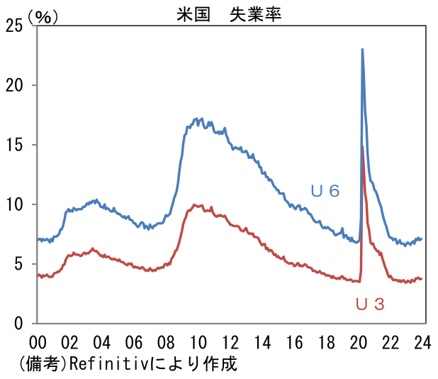 失業率は3.7%と横ばい。2023年1月の3.4%から小幅に上昇したとはいえ、景気後退を象徴するような一方的上昇には至っていない。失業者を広義の尺度で捉えて算出するU6失業率(フルタイムの職が見つからず止む無くパートタイム勤務に従事している人を失業者と見なす)も7.1%へと0.1pt上昇したが、こちらも落ち着いている。