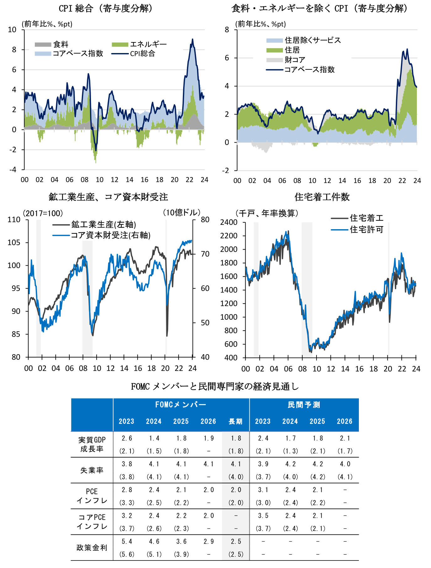2024年の米国経済を巡っては、2023年より減速するものの景気後退は回避する、すなわちソフトランディングが大勢見通しとなっている。FOMCメンバーによる12月時点の経済見通しでは2024年の実質GDP成長率が+1.4%と潜在成長率(長期見通し:+1.8%)を小幅に下回る減速に留まるほか、失業率は24年10-12月期で4.1%と自然失業率(同、4.1%)と同等の着地が予想されている(民間予測[11月時点]:実質GDP成長率:+1.7%;失業率:4.2%)。コアPCEインフレ率は2024年10-12月期には前年比+2.4%(23年10-12月期:+3.2%)へと減速することが予想されており、これによる家計の実質購買力改善は消費を下支えする要因となる。また、2024年を通じて予想されるインフレ減速と複数回の利下げによる実質金利低下は、これまでの累積的な利上げによる住宅投資や設備投資への影響を軽減することが期待される。