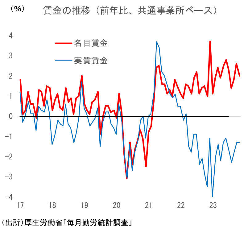 24年春闘でも高い賃上げが実現する可能性が高まっていることは日本経済にとっての好材料である。物価が鈍化傾向で推移する可能性が高いことも相まって、24年秋には実質賃金がプラスに転じることが予想される。もっとも、逆に言えば、24年夏までの消費を巡る環境は厳しい。実質賃金の減少が続くなか、24年度前半に個人消費が持ちこたえることができるかどうかが今後の景気のカギを握る。