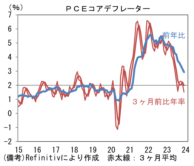 この間、インフレ関連指標はコアCPI、コアPCEデフレーターが共に緩やかな鈍化傾向を辿った。1月26日に発表されたPCEデフレーターを仔細にみると、コアデフレーターの前月比伸び率は+0.2%、前年比では+2.9%となった。一足先に沈静化した財物価に続き、ここへ来てサービス物価も鈍化しており、瞬間風速を捕捉する3ヶ月前比年率は+1.52%まで減速、その3ヶ月平均値は+1.99%まで和らいだ。FOMCにおいて発言力の強いウォーラー理事が好んでいるこの尺度がFedの物価目標である2%を割ったことは一定の意味があろう。とはいえ、今回の数値を以って、声明文におけるインフレの基調判断が現在の「鈍化したが高止まりしている(Inflation has eased over the past year but remains elevated)」から大きく変更される可能性は低く、金融政策の全体の評価に大きな変化はないと判断される。