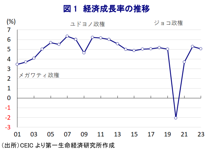インドネシアでは14日に5年に一度となる大統領選挙が実施された。今回の大統領選を巡っては、2014年の前々回の大統領選で勝利した現職のジョコ大統領が現行憲法の規定(連続2期までとする任期を巡る規定)に伴い出馬することが出来ず、いずれにせよ政権交代が行われる。大統領選には3人の候補が出馬しているが、事前の世論調査においては一貫して現政権で国防相を務めるプラボウォ氏がトップを走るなど、2014年、2019年と過去2回の大統領選でいずれもジョコ氏に敗れた同氏が『3度目の正直』を実現するかに注目が集まった。さらに、プラボウォ氏は3度目の正直への足場固めを図るべく、退任が迫るなかでも現職のジョコ大統領が依然として国民の人気が高いなか、ジョコ氏の長男で同国南部スラカルタ市長を務めるギブラン氏を副大統領候補に据えるとともに、『ジョコ路線』の継承を掲げるなど『抱き付き作戦』に動いた。しかし、ギブラン氏の出馬を巡っては、その判断を下した憲法裁判所長官が倫理違反を理由に免職されるなど(注1)、『庶民派』を謳ってきたジョコ氏の『化けの皮』が剥がれたことも重なり批判が高まる動きがみられた。また、ジョコ氏やギブラン氏は政権を支える最大与党の闘争民主党(PDI-P)所属にも拘らず、同党の公認候補であるガンジャル氏(前中ジャワ州知事)を推さなかったため、同党支持者の間に分裂を招く事態となった。他方、大統領選ではプラボウォ、ガンジャルの両陣営が基本的にジョコ路線の継承を謳う一方、ジョコ路線の見直しを謳うアニス氏(前ジャカルタ特別州知事)との三つ巴の選挙戦による激戦が展開された。上述のように世論調査では一貫してプラボウォ氏の優勢が伝えられる一方、第1回投票で半数を上回る票を獲得する候補が居なければ上位2名による決選投票に持ち込まれるため、プラボウォ陣営としては第1回投票での勝利を確実にすべくSNSを駆使するなど、過去2回の選挙戦で『強い指導者像』を前面に押し出したのとは異なる動きをみせた。これはプラボウォ氏がスハルト元政権下の国軍戦略予備軍司令官で当時に民主活動家の誘拐や東ティモールの独立派の虐殺に関与したとの疑惑が持たれるなど高齢層を中心に同氏への忌避感が根強い一方、有権者に占める若年層の割合が高まっていることも影響して『好々爺』を演出する戦略に打って出たとみられる。ただし、こうした事情も影響して候補者討論会ではアニス氏を中心にプラボウォ氏に厳しい質問を浴びせるなど本性をあぶり出す動きをみせたことで、プラボウォ氏が激高、罵倒するなど馬脚を露す場面もみられた。こうした状況ながら、プラボウォ氏はジョコ現政権による産業高度化路線の継続による雇用創出を目指すとともに、鉱業部門のみならず、農業や漁業部門においても未加工品の輸出制限により加工関連など付加価値の高い産業を誘致することにより、経済成長率を6~7%に引き上げることを目標に掲げた。さらに、ジョコ政権の『肝煎り』で地域間格差の是正を目的とする新首都(ヌサンタラ)への移転も継続する考えを示しており、この点でもジョコ路線の継承を謳う姿勢をみせた。大統領選の開票結果については遅くとも来月20日までに公表される予定であるものの、世論調査会社の集計によればプラボウォ氏の得票率は50%を上回る見通しが示されているほか、選挙管理委員会による中間発表においてもプラボウォ氏の得票率は同様に50%を上回る結果が示されており、これを受けてプラボウォ陣営は『勝利宣言』を行った。勝利宣言においてプラボウォ氏は「この勝利はすべてのインドネシア国民の勝利でなければならない」と述べるとともに、大統領就任に向けた組閣に意欲を示しており、向こう5年はジョコ路線が継続される見通しが高い。なお、大統領選と同時に実施された議会下院(国民議会)総選挙を巡っては、多数の政党が乱立するとともに、いずれの政党も単独で多数派を形成する見通しが低いことを勘案すれば、今後は政権樹立に向けた政党間交渉が激化することが予想される。ジョコ政権の2期目入りに際しては、大連立により議会下院の約8割を上回る与党連合を構築することで政権基盤の安定化を図り、トップダウンによる施策や法改正を進めることが可能となる一方、直前には権力のチェック機能を低下させるなど民主化の後退に繋がる動きが前進した経緯がある(注2)。さらに、一昨年には刑法改正により大統領や政府に対する『侮辱』行為に対する取り締まりを強化する内容が盛り込まれるなど、報道の自由やプライバシー、人権侵害などが懸念される動きもみられた(注3)。プラボウォ氏自身は民主主義に対する関心が薄いとされるなか、今後はこうした動きが一段と進むとともに、加速していくことに注意する必要性は高いと見込まれる。他方、大統領選の直前にはジョコ政権が食料インフレ対策を目的に貧困層を対象とする現金給付の拡充を決定するなど、知識人を中心に大統領選