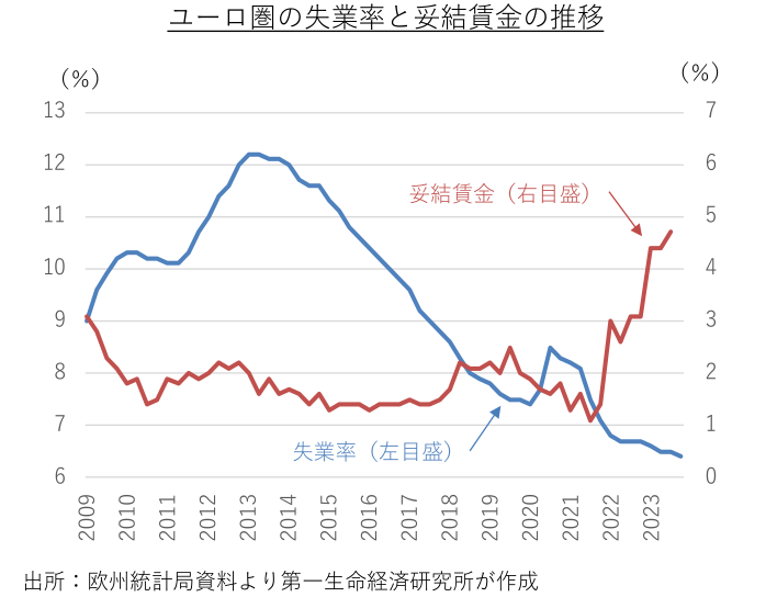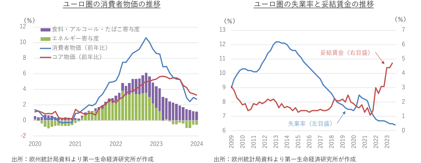 エネルギー価格の押し上げ剥落に加えて、食料品価格のピークアウトが進んでおり、先行きのユーロ圏の物価上昇率は一段の鈍化に向かうことが予想される。過去の物価高を遅れて反映し、賃金上昇率の高止まりが続いている。だが、景気低迷による需給緩和やヘッドラインの物価上昇率の鈍化を受け、賃上げペースは徐々に鈍化に向かう公算が大きい。賃金上昇率のピークアウトを確認した後、ECBは年央にかけて利下げを開始する展開を予想する。