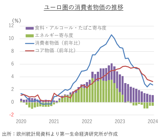 物価のピークアウト傾向が鮮明となっている。ユーロ圏の消費者物価は2022年10月に前年比+10.6%で統計開始以来の過去最高を記録した後、エネルギー価格の押し上げ剥落、食料品価格のピークアウト、景気低迷による需給逼迫の緩和などから、最新の数字が得られる2024年1月には同+2.8%まで上昇率が鈍化した。だが、過去の高インフレを反映した高めの賃上げ妥結が続いており、変動の大きい食料やエネルギーなどを除いたコア物価は同+3%台前半で足踏みしている。特にサービス物価の高止まりが目立ち、中長期的な物価安定の達成には、賃金上昇率の動向が鍵を握る。