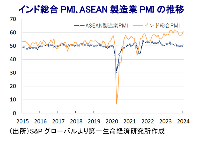 中国以外のアジア新興国では、中国経済への依存度が相対的に高いASEANやNIEs諸国にとっては中国景気の行方の影響を受けやすい展開が続くことは避けられない。一方、米中摩擦やデリスキングを目的とするサプライチェーン見直しの動きは対内直接投資の受け入れを促しており、結果的に企業部門による設備投資の動きを下支えすると期待される。また、インフレ鈍化による実質購買力の押し上げが家計消費を下支えすると見込まれる一方、金融政策については『米FRB如何』の展開が続くことが避けられず、中銀による利上げの累積効果が足かせとなる状況が続く可能性はくすぶる。なお、今年のアジアは選挙が目白押しの『選挙イヤー』となるなか、各国政府は食料インフレへの対応を目的にバラ撒き政策に傾注する動きをみせており、一時的に家計消費など内需を押し上げることは期待される一方、その後は反動による下押し圧力に晒されることが考えられる。さらに、コロナ禍で悪化した財政状況を一段と悪化させる可能性があり、世界的な金利高の環境が長期化するなかで幅広い経済活動の足かせとなることが懸念される。また、選挙を意識したインフラ関連を中心とした公共投資の拡充が図られる動きもみられることを勘案すれば、当面のアジア新興国の景気は民間需要以上に公的需要に下支えされる展開が続くことになると見込まれる。