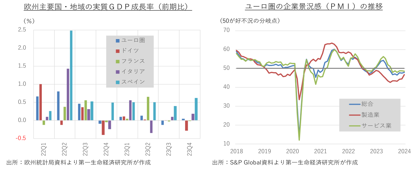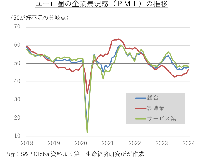 2024年入り後の景気指標には底入れの兆しが僅かに広がっている。代表的な企業景況感であるユーロ圏の購買担当者指数(PMI)の総合指数は、2023年6月以来、好不況の分岐点である50割れが続いているが、落ち込みを主導してきたドイツの製造業を中心に悪化モメンタムが鈍化傾向にある。