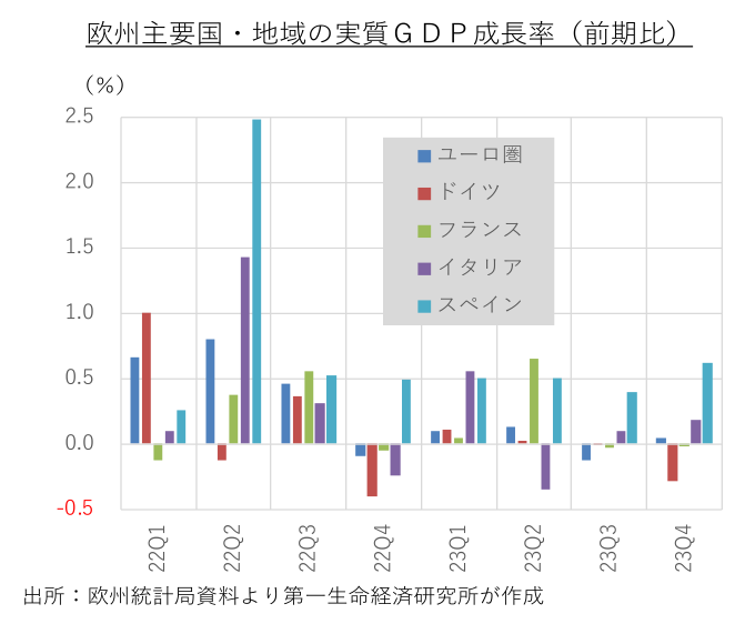 2023年の年間成長率は+0.5%と、新型コロナウイルスの感染拡大時の経済活動停止の反動で高成長となった過去2年から急ブレーキが掛かった。国別の年間成長率は、スペイン(+2.5%)が高成長を記録した一方、ドイツ(▲0.1%)がマイナス成長に転落し、フランス(+0.9%)やイタリア(+0.7%)が低成長にとどまった。