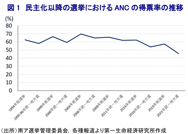 - 南アフリカの大統領府は次期総選挙を5月29日に実施すると発表した。民主化以降の同国ではANCが一貫して与党の座を維持しているが、近年は党勢の退潮が鮮明になっている。2021年の統一地方選では民主化以降で初めてANCの得票率が5割を下回る一方、その背後で左派ポピュリズム政党のEFFが党勢を急拡大させている。慢性的な電力不足やインフラの機能不全による景気低迷が長期化し、インフレ長期化や高失業も重なり政権への不満が高まり、ANCは一段と議席を失う懸念もある。総選挙後の国民議会で実施される大統領選を経てラマポーザ政権が維持される可能性は高いが、少数与党となれば政権運営に苦慮することは避けられない。同国経済はファンダメンタルズが脆弱ななか、次期政権の枠組如何ではランド相場を大きく揺さぶる材料となることも考えられるなど、極めて不透明な状況となる可能性がある。