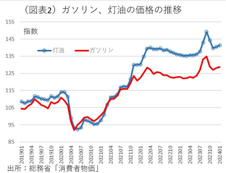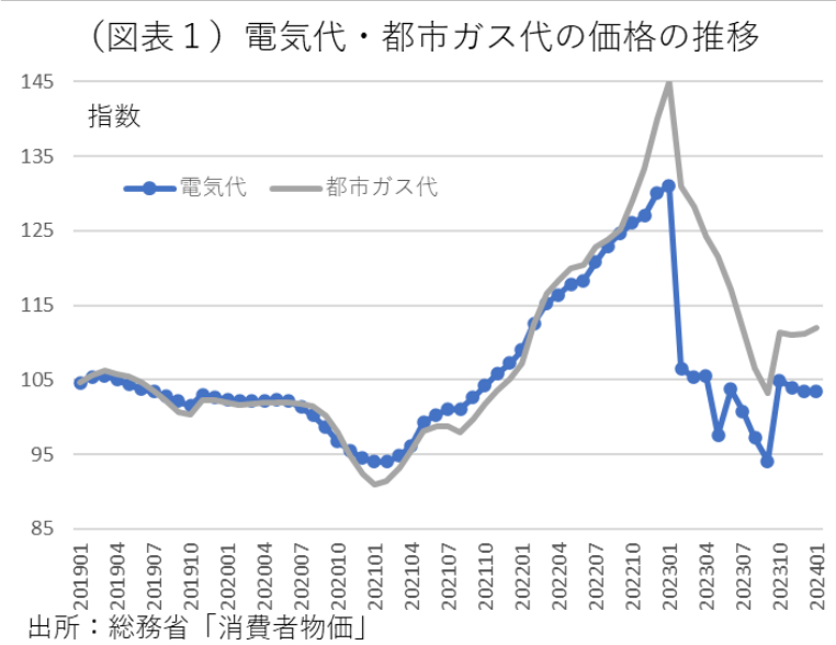 期限通りの措置であれば、2024年5月にその支援が1kwh当たり1.8円(支払いは6月)になり、6月検針分から支援がなくなる。電気ガスの推移をみると、料金のピークは、2023年1月だった。もしも、価格補助を完全に止めたとしても、そのピークよりは料金は低い水準に止まりそうだ(図表2)。一部の電力会社は、原発稼働を予定しているから、燃料価格の高騰が従来よりも効きにくくなる。