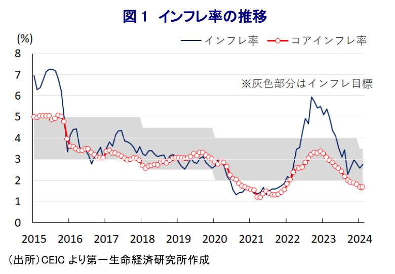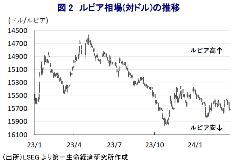 インドネシアで先月実施された大統領選を巡っては、直後にプラボウォ国防相が勝利宣言を行うなど『三度目の正直』を果たしたとみられ(注1)、選挙管理委員会は20日に同氏が当選した旨を発表しており、10月に就任することとなった。他方、一昨年来の同国においては商品高や国際金融市場における米ドル高を受けた通貨ルピア安に伴う輸入インフレが重なり、インフレが大きく上振れして一時は7年ぶりの高水準となる事態に直面した。よって、中銀は一昨年後半以降に物価と為替の安定を目的に累計250bpもの断続利上げを余儀なくされたものの、インフレが高止まりするなかで物価高と金利高が共存するなど実体経済に悪影響を与えることが懸念された。なお、一昨年末以降は商品高の動きが一巡しているほか、こうした動きも追い風にインフレは頭打ちに転じており、足下のインフレは中銀目標の範囲内で推移するなど落ち着きを取り戻している様子がうかがえる。しかし、昨年のインフレ鈍化の動きは前年に加速した反動が大きく影響している上、足下ではエルニーニョ現象など異常気象による農作物の生育不良を理由とする食料インフレなど、生活必需品を中心にインフレ圧力がくすぶる状況が続いている。さらに、昨年末以降の国際金融市場においては米ドル高の動きに一服感が出る動きがみられたものの、年明け以降は米FRB(連邦準備制度理事会)による利下げに対する観測が揺れる度に米ドル高が意識されるとともに、ルピア相場は上値が抑えられる展開が続いている。よって、輸入インフレの再燃が警戒されるなか、中銀はルピア相場の維持を目的にスポット市場、ルピア建ノンデリバラブルフォワード市場、債券市場の3市場における為替介入に動くなどの対応を迫られているものとみられる。他方、昨年の経済成長率は+5.05%と堅調な推移をみせているものの、前年(+5.31%)から鈍化するとともに政府目標(5.3%)をも下回っているほか、その内容を巡っても金利高が長期化するなかでその累積効果が足かせとなる形で家計消費をはじめとする内需は力強さを欠いており、見た目と比べて厳しい状況に直面していると捉えられる(注2)。上述のように足下のインフレは一見すると落ち着きを取り戻しており、景気に配慮すれば中銀による利下げも選択肢に入ることが考えられる一方、仮に中銀が利下げに踏み切ればルピア安を通じた輸入インフレを誘発させる可能性があるなか、中銀としては金融市場環境にも配慮せざるを得ない難しい状況に直面している。