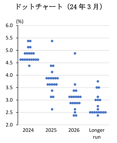 同時に公表された四半期経済見通しにおいては、2024年のGDP成長率が+2.1%(前回12月:+1.4%)、コアPCEインフレ率が+2.6%(+2.4%)とそれぞれ上方修正された。一方、政策金利見通しに関しては2024年が4.50-4.75%(4.50-4.75%)と年内3回の利下げ見通しに変化はなかったものの、2025年は3.75-4.00%(3.50-3.75%)、2026年は3.00-3.25%(2.75-3.00%)と小幅に上方修正され、高金利政策をより長期に亘って維持する可能性が示唆された。