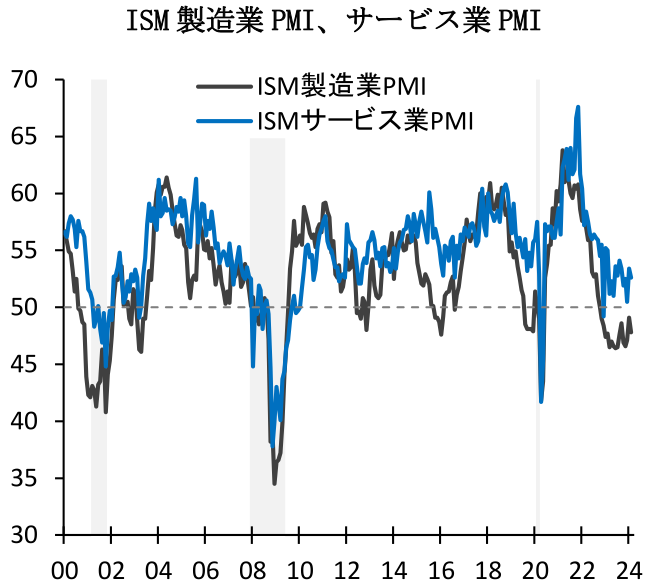 2月ISM製造業PMIは47.8(1月:49.1)と市場予想(49.5)に反して3か月振りに低下した。製造業活動は足下で持ち直しの動きを示していたものの、2月は再び低下し好不況の節目となる50を16か月連続で下回るなど、停滞の域を脱していない。内訳をみると、生産が48.4(1月:50.4)、生産活動に先行する新規受注が49.2(52.5)と共に2か月振りに50を下回ったほか、雇用も45.9(47.1)と2か月連続で前月水準を下回った。他方2月ISMサービス業PMIは52.6(53.4)と2か月振りに低下した。サービス業活動は足下で減速の兆しを示しているものの、節目となる50を14か月連続で上回るなど底堅く推移している。内訳をみると、事業活動が57.2(55.8)、新規受注が56.1(55.0)と共に前月から上昇した。一方、雇用は48.0(50.5)と前月水準を下回ったほか、入荷遅延が48.9(52.4)と前月の悪天候の影響が剥落したことを背景に低下した(詳細は「米国 製造業回復の動き足踏み(24年2月ISM製造業)」及び「米国 ヘッドラインよりも良い内容 (2月ISM非製造業)」)。
