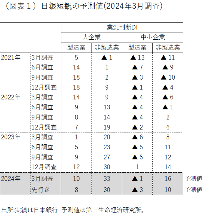 3月19日に日銀が決定したマイナス金利解除は、まだ短観結果にはほとんど反映されていないと考えられる。しかし、政策変更の手前で、資金繰り・貸出態度DIは改善していたと予想される。事後検証になってしまうが、そうした金融関連DIが緩和的であれば、日銀の政策変更のネガティブなインパクトはそれほど大きくないと判断できる。これまで注目されることが少なかった金融関連DIも、今回に限ってはその様子に関心が集まることになるだろう。