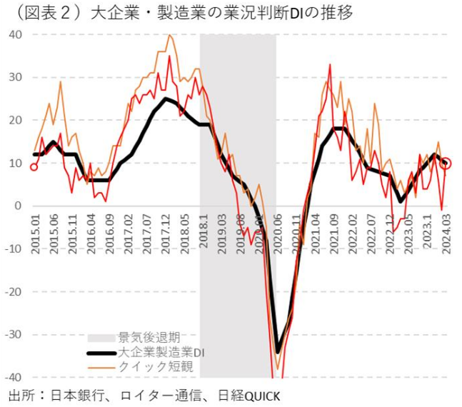 4月1日に発表予定の日銀短観3月調査では、大企業・製造業の業況判断DIが前回比▲2ポイントの悪化となり、10の「良い」超となる見通しである(図表1、2)。自動車メーカーの不祥事で出荷停止が起こり、2024年1月の生産活動は大幅に減少した。1-3月にかけてはその悪影響が色濃く、収益面での悪化が免れられない。この影響が輸出面でも影を落とし、2月の実質輸出も悪化させている。自動車産業は裾野が広いだけに、素材・機械業種にも波及していると考えられる。ロイターの月次調査では、そのインパクトが単月に限定されているので、時間が経過すれば和らいでいくと筆者はみている。