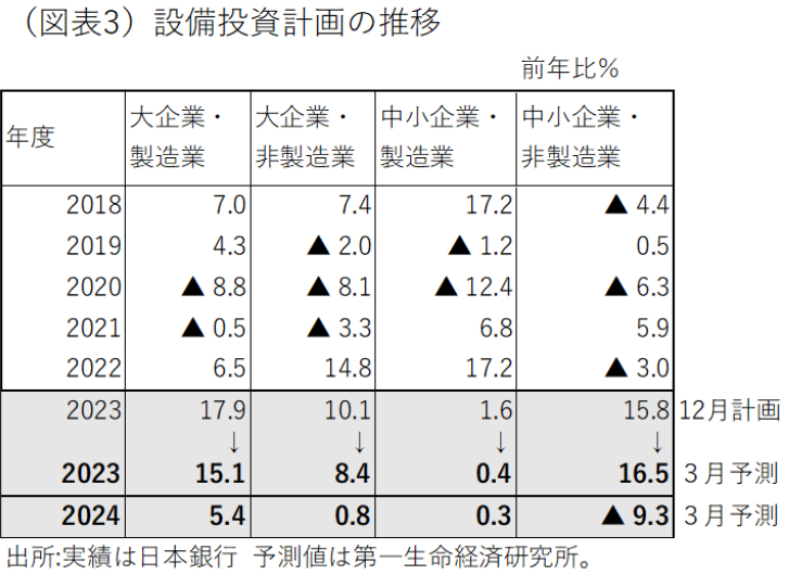 短観ベースの設備投資は、他のマクロ指標よりも好調である。特に、大企業・製造業と中小企業・非製造業の設備投資は、2023年度の前年比が15%を上回る高い伸びになりそうだ(図表3)。GDP統計でも、2023年10-12月の実質設備投資が伸びていた。景気の牽引役として、企業の設備投資が堅調なのかどうかを確認することが、この短観ではできそうだ。