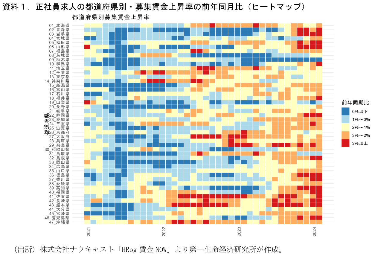 今回、このデータを用いて、都道府県別の賃金動向を分析してみた。次ページの資料1では都道府県別・正社員求人の募集賃金について、各月の推移を5段階でヒートマップ化した。青(0%以下)・薄青(0~1%)・黄(1~2%)・薄赤(2~3%)・赤(3%以上)の順に賃金上昇率が高いことを示している。資料からは直近値の2024年2月に近づくほど赤系の占める割合が増えており、賃金上昇圧力が全国的に強まっていることが見て取れる。企業が人手不足の下で中途採用を拡大する動きもみられる中、募集賃金の引き上げを通じて人材の確保を図っているのだろう。