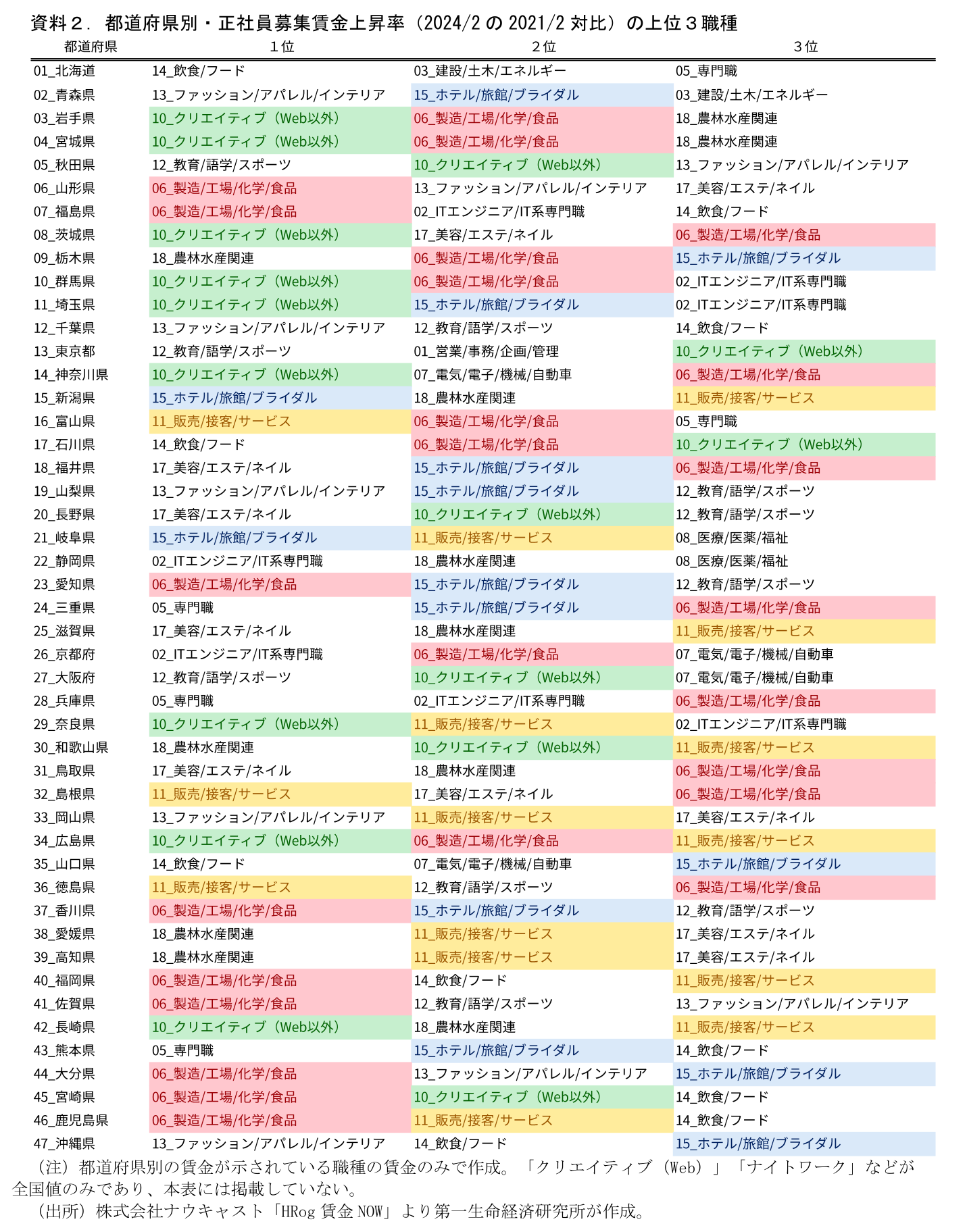 また、地域別にみたときの直近値の特徴として、特に正社員賃金においてチャートの上側と下側、東北地方や九州地方が濃い赤で占められていることがわかる。次に、資料2では都道府県別・職種別の募集賃金について、より大きなトレンドを見る観点で3年前同月比(2023年2月/2021年2月)を取り、伸び率の高かった上位3職種を抽出、頻度の多い職種に色を付けている。職種別にみると、九州地方・東北地方ではともに「製造/工場/化学/食品」が伸び率の上位にあるという共通点を確認できた。