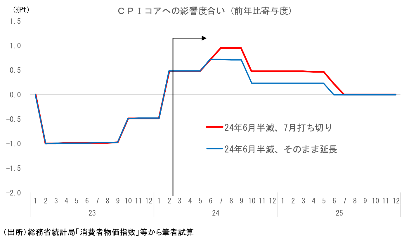 現在、毎月の電力使用量が400キロワットアワーの標準的な世帯で月額1400円、毎月のガス使用量が30立方メートルの標準的な世帯で月額450円の補助が実施されている。そのため、これが打ち切りになれば、合わせて月額で1850円、年間で2万2200円の家計負担増となる。 また、消費者物価指数への影響としては、23年2月1の導入当初は▲1.0%Pt程度、23年10月以降は▲0.5%Pt程度となっているものが、24年6月に▲0.25%Pt程度、7月からはゼロとなる。現在(▲0.5%Pt)と比較して、支援打ち切りによってCPIコアは0.5%Pt分押し上げられる形である。