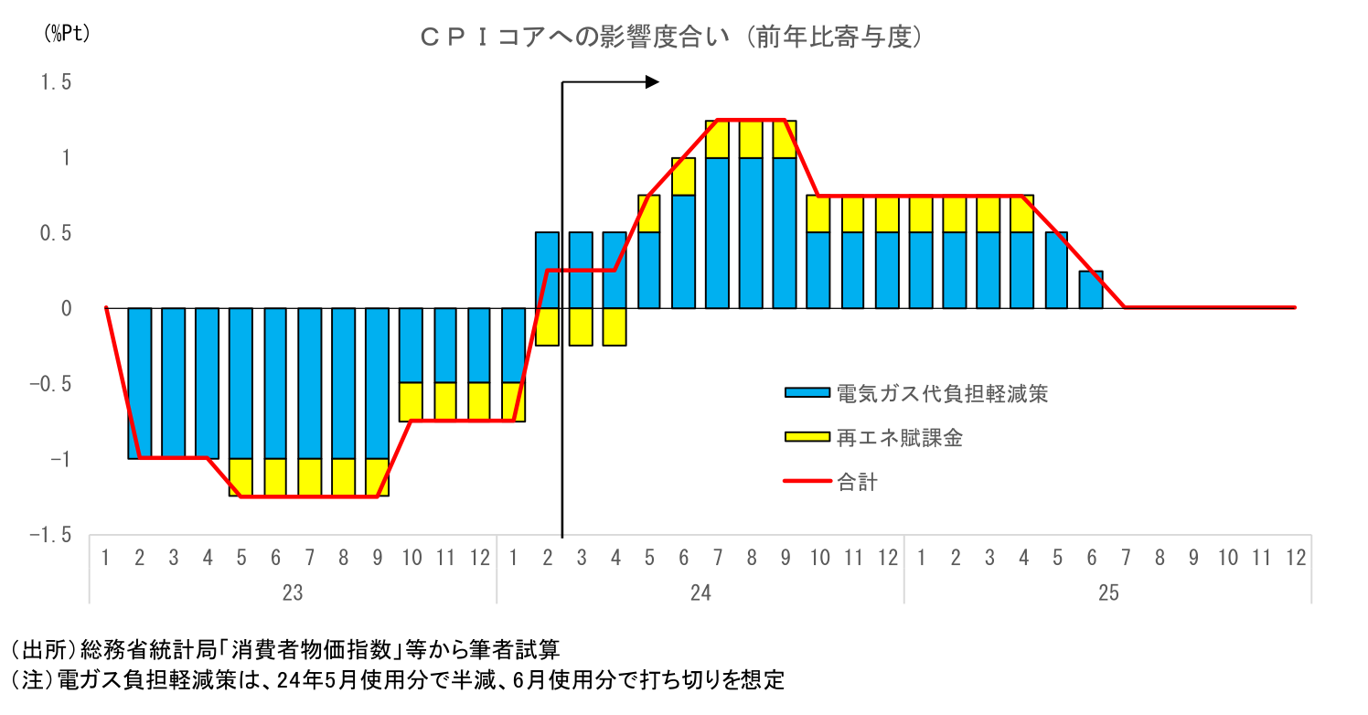 なお、CPIへの影響を見る上では、前年の裏の影響を勘案することも重要だ。そこで、電気・ガス代負担軽減策のCPIコア前年比に与える影響度合いを見たものが下図である。
