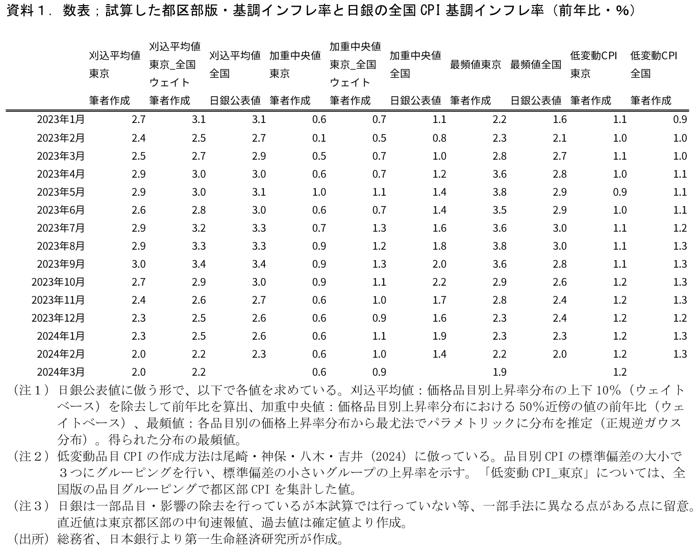 星野(2023)「東京都区部版・日銀基調的インフレ率の試算」第一生命経済研究所 Economic Trends