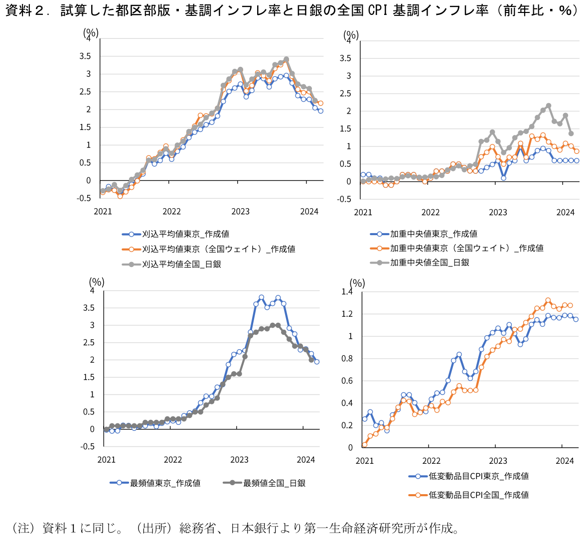 以前のレポートで試算した①東京都区部版の基調的インフレ率3指標、②日銀が賃金から物価への波及度合いを分析する際に利用した低変動品目CPIについて、本日公表の3月都区部CPIを用いて計算した。