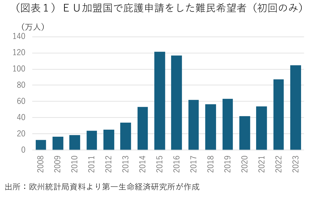 まず、難民の状況を確認する。2023年にEU域内で国際的な庇護申請をした難民希望者(初回申請者のみ)は105万人と前年から約20%増え、2015~16年にシリア難民が欧州に押し寄せた難民危機時以来の100万人を突破した(図表1)。EUや加盟国の移民・難民政策の厳格化やコロナ危機による渡航制限もあり、2020年に40万人台に減少した後、3年連続で増加している。