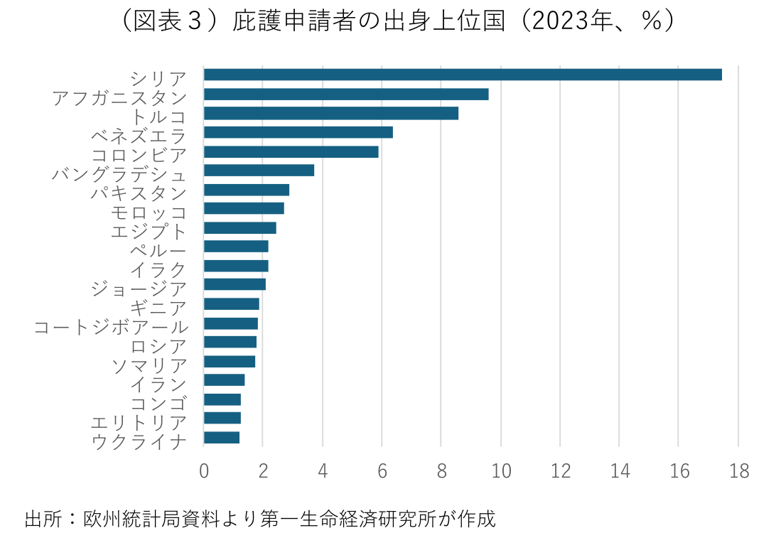 庇護申請者の出身地域の内訳は、中東が33%で最も多く、アフリカの23%、南北アメリカの17%、欧州(トルコ、ウクライナ、ロシアを含む)の17%、アジアの9%と続く(図表2)。国別には、泥沼の内戦が続くシリアが17%と最大で、米軍撤退後にタリバンが権力を掌握したアフガニスタンが10%、反体制派(ギュレン派)や少数民族(クルド人)に対する締め付けを続けるトルコが9%、社会混乱や生活困窮が続くベネズエラ、内戦が続くコロンビアが各6%と続く(図表3)。シリアは2013年以来、10年連続で最多の庇護申請者の輩出国で、アフガニスタンも6年連続で第2位となっている。