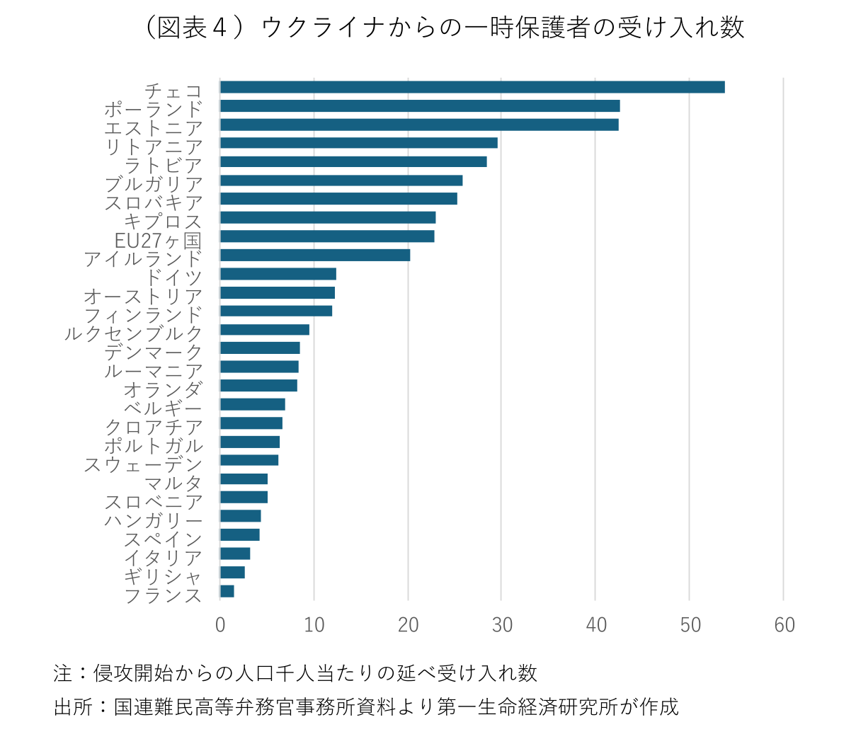 ウクライナの庇護申請者は2022年に2.5万人、2023年に1.3万人にとどまるが、これはロシアによるウクライナ侵攻を受け、EUが「一時保護指令」を発動し、個別の庇護申請を必要としない集団的な保護を提供していることによる。保護対象の避難民に対しては、在留、労働市場や住宅へのアクセス、医療支援、子どもへの教育などが提供される。一時保護措置はまず1年間適用され、6ヶ月毎に最長1年自動延長され、欧州委員会の勧告に基づき、さらに1年延長することができる。国連難民高等弁務官事務所(UNHCR)によれば、3月14日時点で欧州(EU以外も含む)に避難しているウクライナ市民は598万人。進攻開始からこれまでに、ポーランドやチェコなど近隣諸国で庇護対象となった市民が約300万人、ドイツやスペインなど他の欧州諸国が約250万人に達する。最大の受け入れ国はポーランドの164万人で、ドイツの105万人、チェコの59万人、スペインの20万人、イタリアの19万人と続く。人口千人当たりのウクライナの庇護対象者は、近隣のチェコ、ポーランド、バルト三国が多い(図表4)。一時保護が失効するまでの間、個別の庇護申請をしていない避難民が大半とみられ、EUの庇護申請者の統計には現れていない。ウクライナからの避難民を含めると、2015~16年の難民危機を遥かに上回る難民が欧州内に流入している。