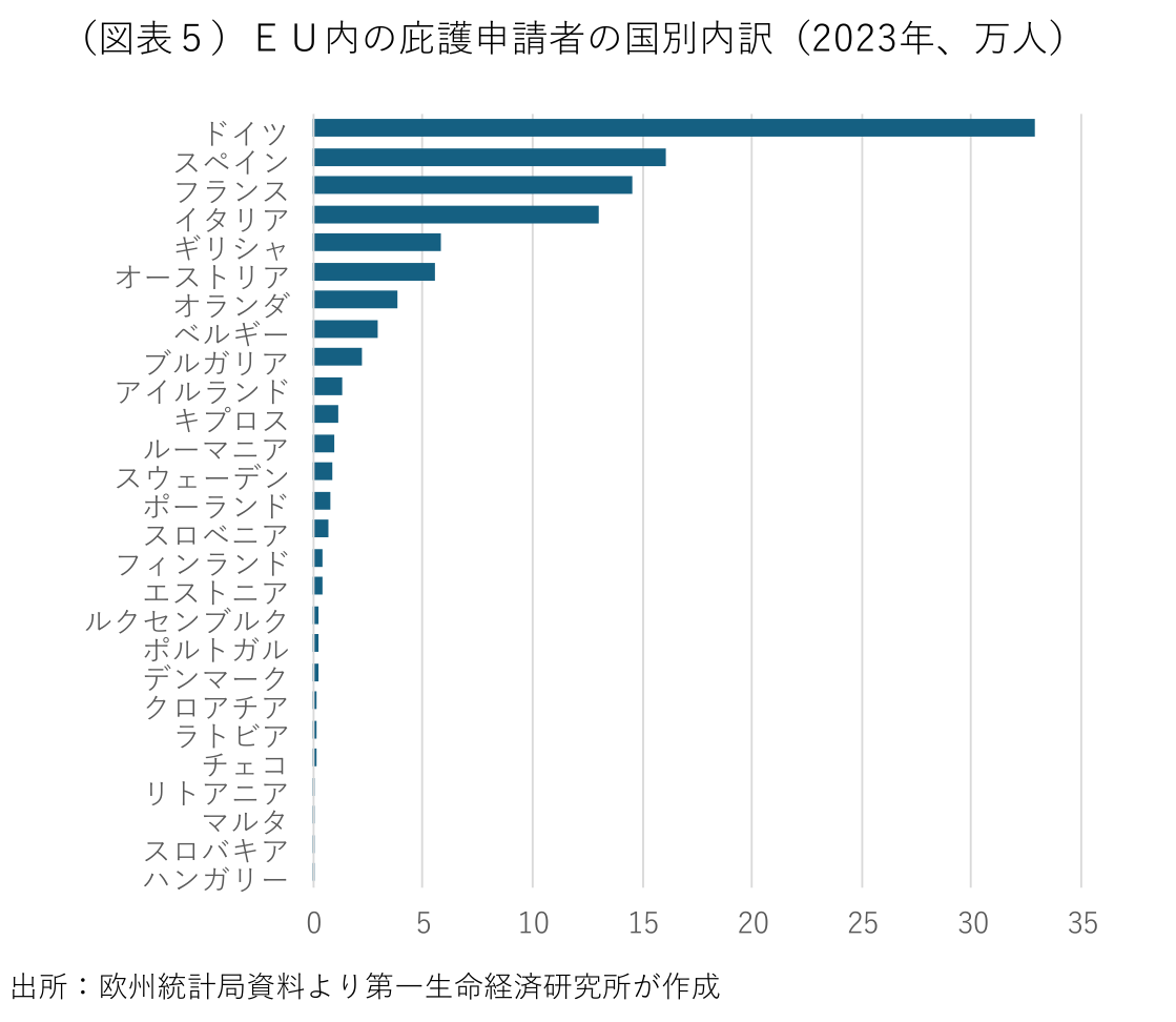庇護申請(ウクライナの一時保護を除く)を受けたEU加盟国の内訳は、ドイツが33万人とEU全体の約3分の1を占め、スペインの16万人、フランスの15万人、イタリアの13万人、ギリシャとオーストリアが各6万人と続く(図表5)。EUの4大国(ドイツ、フランス、イタリア、スペイン)で全体の約4分の3を占める。シリア、アフガニスタン、トルコを始め多くの避難民はドイツで庇護申請をしている。ベネズエラやコロンビアなど中南米からの避難民はスペインで、バングラデシュやパキスタンなど南アジアからの避難民はイタリアで、コートジボアールやギニアなどアフリカからの避難民はフランスで庇護申請をするケースが多い。人口千人当たりの庇護申請者の数が多いのは、キプロスの約13人が最多で、オーストリアとギリシャが約6人、ルクセンブルクとドイツが約4人と続く。EU全体では人口千人当たりで約2人の庇護申請者がいる。