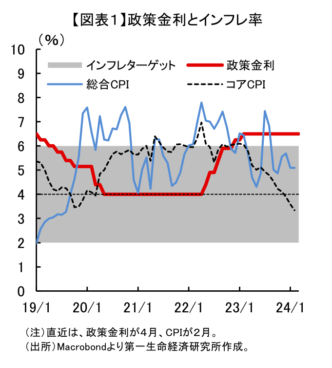 23年2月会合で利上げ(+25bps、6.25%→6.50%)をして以降、7会合連続の据え置き。 -
