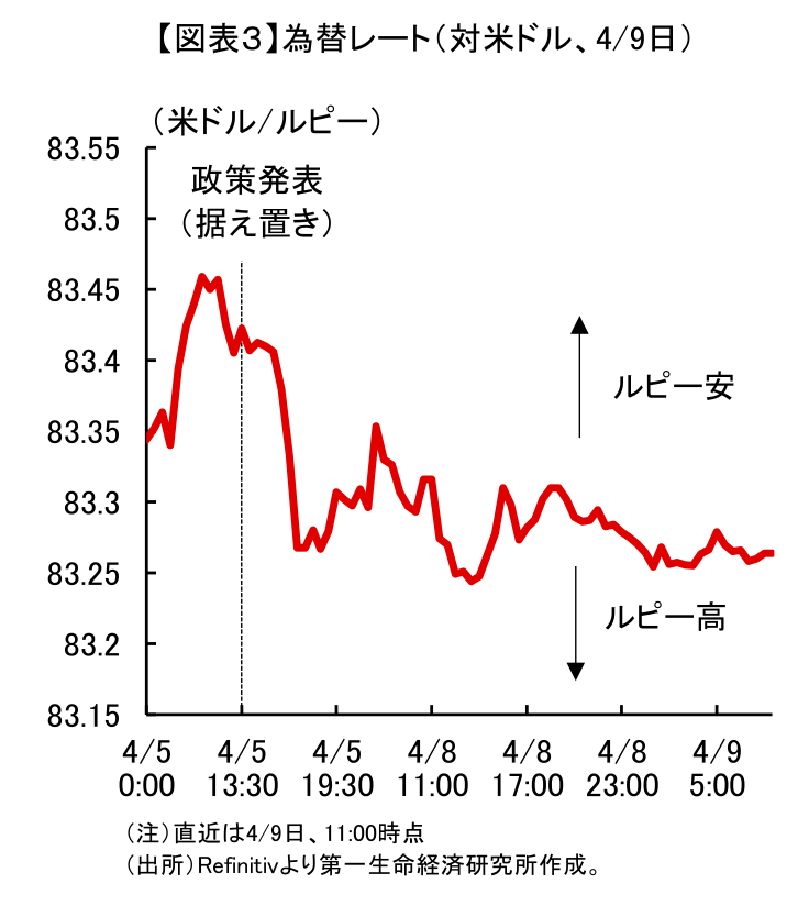 なお、今回の据え置きの政策決定は、市場予想通りであったこともあり、為替への影響は限定的。ただ、足もとでは、対米ドルで幾分増価している。政策決定後に発表された消費者コンフィデンスが高水準となったこと等からインド市場の底堅さが好感され、株価が引き続き上昇、インドルピーが買われたとみられる(図表3)。