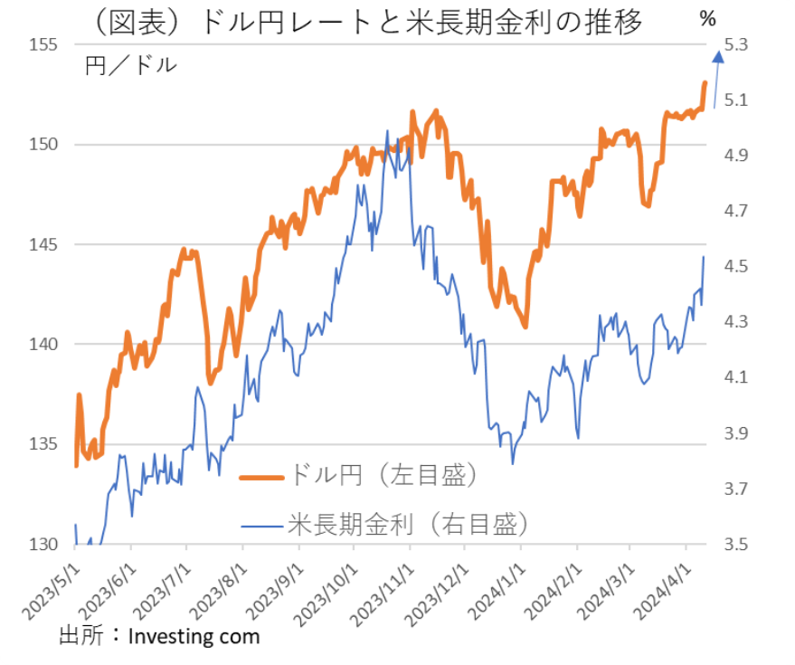 - 円安が歴史的水準に移行している。為替レートが1ドル153円台を付ける場面もあった。為替介入の警戒感が強まっている。しかし、米長期金利の上昇を背景にしたドル高だから、必ずしも投機的ではない。為替介入も効かない可能性がある。この円安で日本の物価上昇圧力が高まるので、日銀も従来の姿勢を見直す可能性がある。
