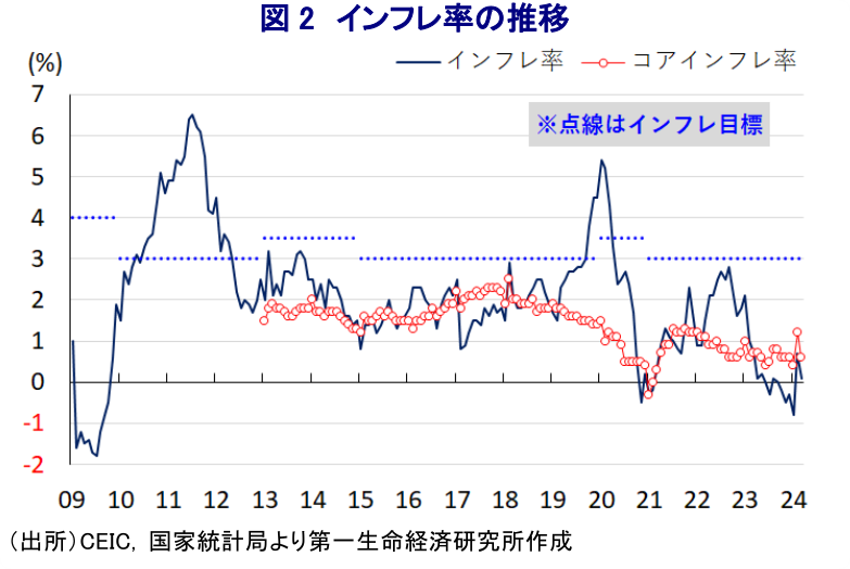 今年は春節連休の時期のズレが統計を狂わせているが、3月のインフレ率は前年比+0.1%と2ヶ月連続のプラスとなるも伸びは鈍化している。前月比も▲1.0%と4ヶ月ぶりの下落に転じており、春節後の生鮮品を中心とする食料品の価格下落が重石となっている。ただし、コアインフレ率も前年比+0.6%に鈍化し、前月比▲0.6%と下落し、財・サービスの両面で幅広くディスインフレ傾向が続いている様子がうかがえる。