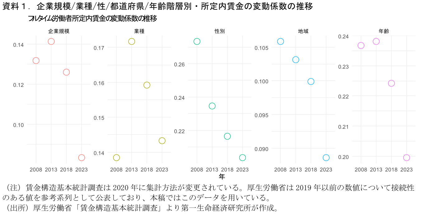 ただし、賃金の上がり方の差をみるうえで、軸は年齢だけではない。今回、厚生労働省の「賃金構造基本統計調査」を用いて、複数軸での賃金格差の長期的な推移を確認してみた。具体的には、企業規模×業種×性別×地域×年齢階層の5つの軸ごとの所定内賃金(フルタイム労働者)について、それぞれ2008年・2013年・2018年・2023年の5年おきのデータセットを構築し、それぞれの軸について変動係数を算出した。変動係数はデータのばらつきを示す標準偏差を平均値で割って標準化したものであり、相対的な格差の指標として用いることができる。結果は資料1だ。昨今話題となっている「年齢」の軸のみでなく、その他の軸で見ても賃金格差は低下する傾向にあることがわかる。