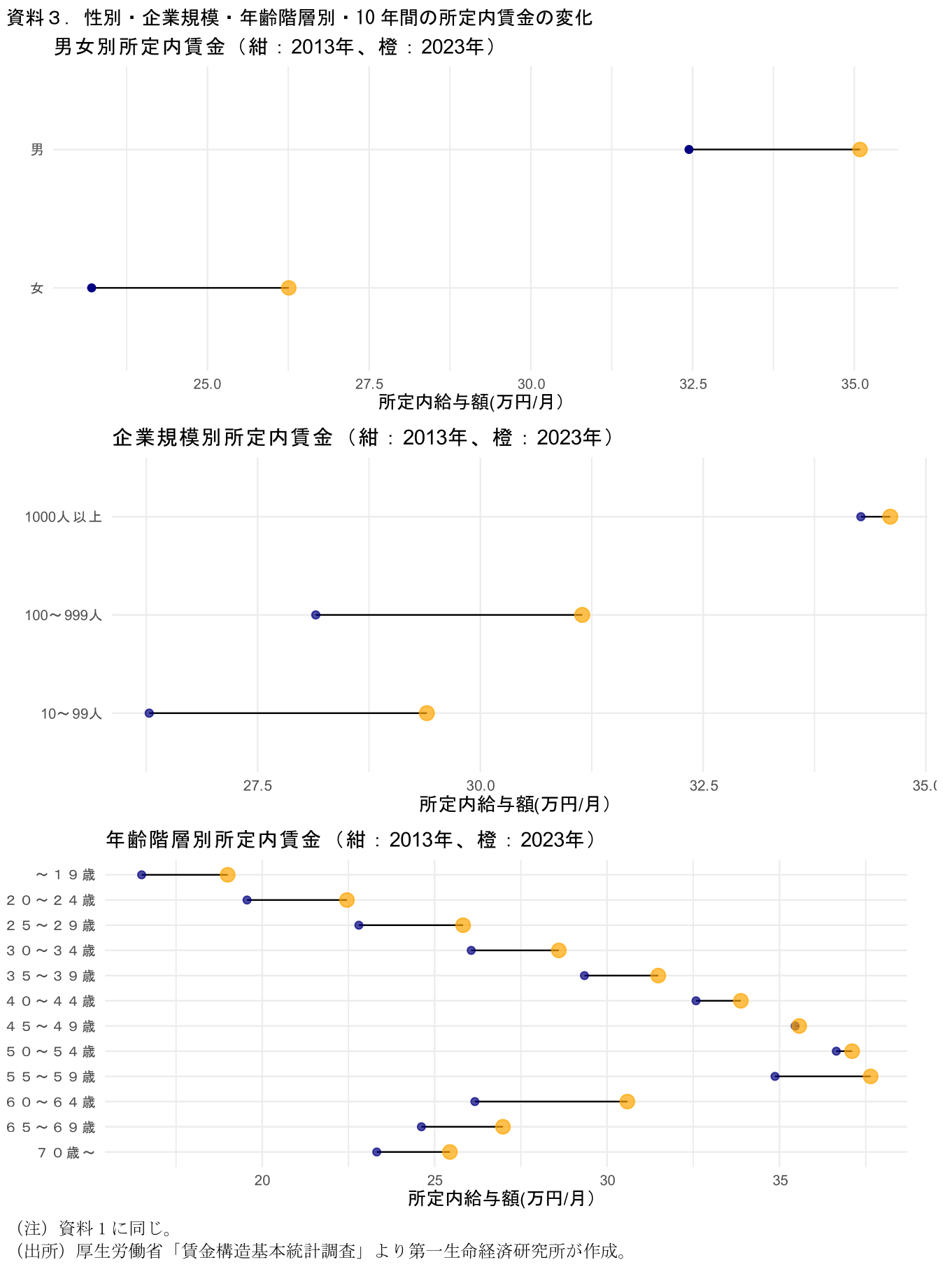 以下の資料2~4では今回分析対象とした5軸について、2013年と2023年の値をプロットしてここ10年間の動向を確認したものである。資料1でみたように賃金格差はいずれの軸でも低下しているが、賃金の上がり方は高賃金層でより小さく、低賃金層でより大きくなる傾向があることが確認できる。