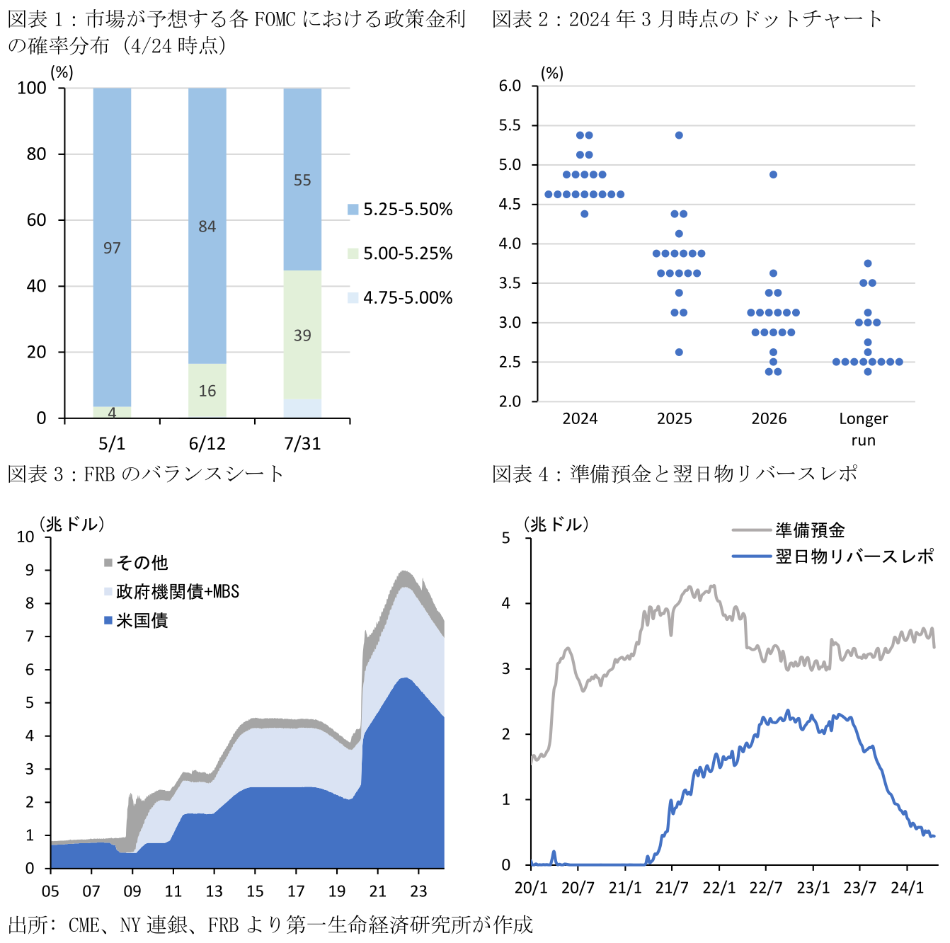5月FOMC(4/30~5/1開催)では6会合連続で政策金利の現状維持が決定される見通しだ。4/24時点のCMEのFedWatch(FF金利先物)に基づくと、市場による政策金利(現行:5.25~5.50%)の据え置き予想が96.5%に達しており、25bpsの利下げを見込むのは3.5%に留まる(図表1)。FRBは現行の高金利政策を維持しつつ、インフレ鎮静化の進展を注視する姿勢を引き続き示すとみられる。