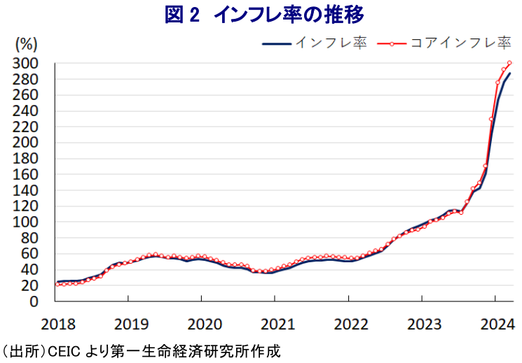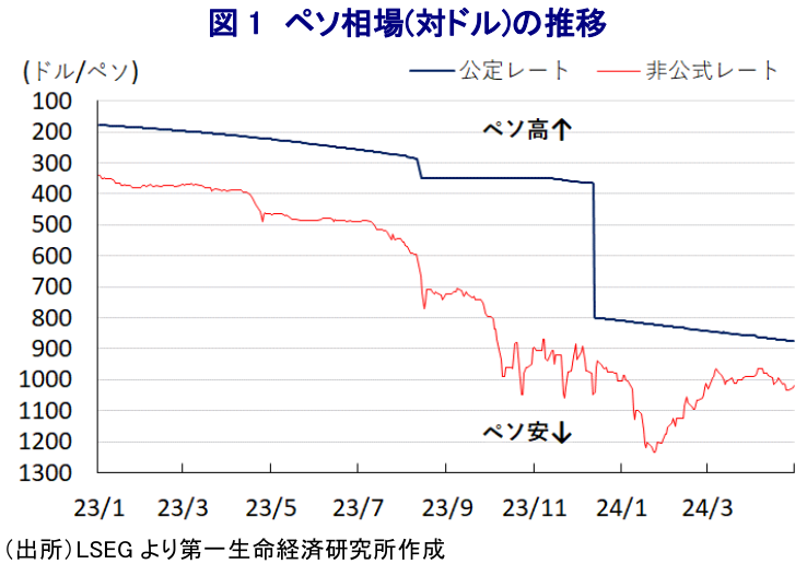 アルゼンチンでは、昨年実施された大統領選において右派ポピュリスト政党である自由の前進から出馬したリバタリアン(自由至上主義)を標ぼうするミレイ氏が勝利するとともに、ミレイ政権は発足早々から矢継ぎ早に『ショック療法』的な経済改革を打ち出す動きをみせている(注1)。政権交代前の同国では、通貨ペソ相場を巡って公定レートと非公式レートの乖離が広がる動きがみられたものの、政権発足直後に中銀は公定レートの切り下げを決定したことで乖離幅は大きく縮小した。その後はミレイ氏が掲げる中銀廃止やペソ廃止による経済のドル化が警戒される形で非公式レートを中心にペソ安圧力が強まる動きがみられたものの、ミレイ氏が打ち出す経済改革を巡って金融市場やIMF(国際通貨基金)などが評価する動きをみせており(注2)、足下にかけて乖離幅は再び縮小する動きをみせている。なお、昨年末にかけてのインフレはペソ安による輸入インフレの動きも追い風に加速する展開が続いたほか、政権交代直後の切り下げの動きも追い風に年明け以降もインフレは一段と加速の度合いを強めている。さらに、足下の貧困率は6割弱に達するなど国民生活は極めて厳しい状況に追い込まれるなか、インフレが常態化するなかで賃金交渉を巡る労使協議の決裂を受けて政府は最低賃金の大幅引き上げに関する大統領令を交付するなどの動きをみせている。結果、3月のインフレ率は一段と加速の動きを強めて前年同月比+287.9%、コアインフレ率は同+300.0%となるなど、とんでもない水準に達している。こうした状況ながら、中銀は3月に政策金利を引き下げ(注3)、先月11日にも2ヶ月連続の利下げを決定しており(注4)、月次インフレの上昇ペースが鈍化していることを理由にインフレ抑制に自信を覗かせる姿勢をみせてきた。他方、同国を含む中南米地域ではエルニーニョ現象など異常気象の頻発を理由とする食料インフレ圧力が強まる動きがみられるほか、中東情勢を巡る不透明感の高まりを受けた国際原油価格の底入れによりエネルギー価格も上昇するなど、生活必需品を中心にインフレ圧力が強まる状況に直面している。さらに、上述のように同国においては最低賃金の大幅引き上げも重なりインフレ圧力が掛かりやすい状況にあると判断できるものの、中銀は先月25日にも政策金利を10%引き下げて60%とする決定を行うなど、前回の利下げ実施から2週間で一段の金融緩和に動いた格好である。しかし、中銀は金融政策に関する正式な声明を公表せず、ホームページ上で公表する情報欄のなかで数値の変化を示す異例の対応を採るなど『ステルス』利下げであり、市場予想を上回るペースで金融緩和に動いている。なお、ミレイ政権による歳出抑制を受けて1-3月は財政黒字に転じており、ミレイ大統領は公約に掲げたショック療法的な政策運営が奏功していることに自信を覗かせており、今後も税制改革や労働市場改革、貿易自由化などへの取り組みを積極化させるものと予想される。他方、急激な財政緊縮策による事実上の社会保障の切り捨てにより貧困層が急拡大するなど社会の不安定化に繋がる動きがみられるなか、ミレイ政権による政策運営が持続可能なものとも見通せない。同国はリチウムなど豊富な鉱物資源を理由に世界的に注目を集めているものの、その実体経済については極めて不透明な状況が続くことは避けられないと予想される。