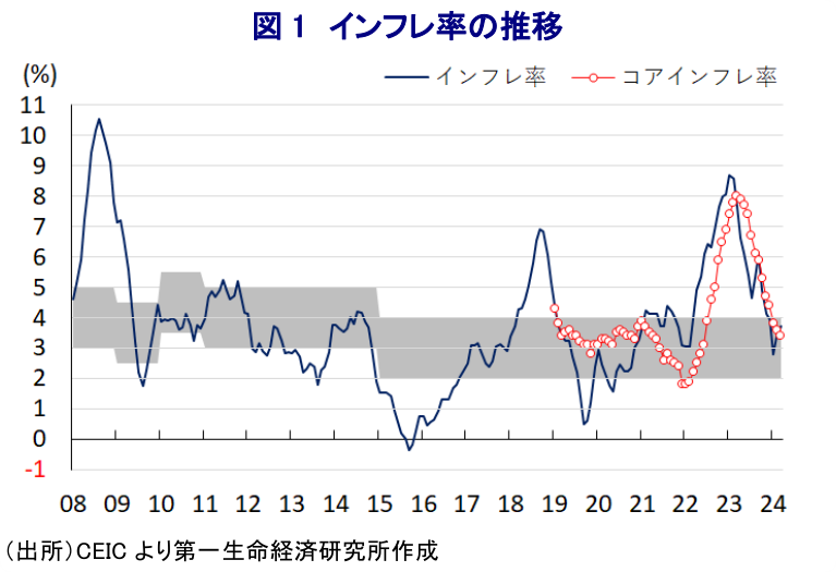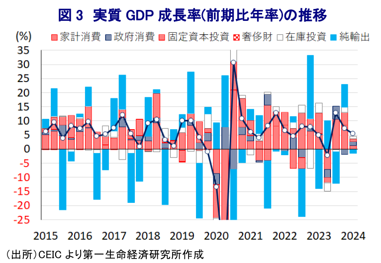 こうした状況ながら1-3月の実質GDP成長率は前期比年率+5.43%と3四半期連続のプラス成長となり、中期的な基調を示す前年比の伸びも加速するなど景気底入れが確認されている。政府消費の堅調さに加え、インフレ鈍化や移民送金の堅調な流入が家計消費を下支えしている。電子部品関連を中心とする輸出拡大や外国人観光客の底入れは外需を押し上げている。ただし、金利高が設備投資の足かせとなっているほか、異常気象による農林漁業の生産低迷など、先行きの景気にとって不透明要因となる動きもみられる。