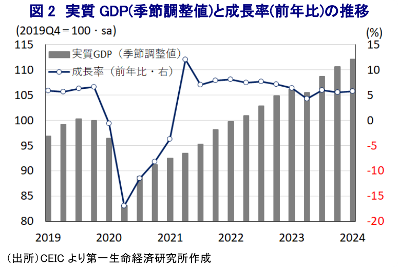 こうした状況を反映して、1-3月の実質GDP成長率は前期比年率+5.43%と前期(同+7.23%)からペースこそ鈍化するも3四半期連続のプラス成長で推移するなど拡大の動きが続いているほか、中期的な基調を示す前年同期比ベースの成長率も+5.7%と前期(同+5.5%)から伸びが加速するなど、足下の景気は底入れしている様子が確認されている。なお、内訳をみると今年度予算は歳出規模が過去最大を更新する拡張型予算となっている上、教育・人材開発・社会保障・福祉・雇用(社会サービス)や公共インフラ(経済サービス)、治安維持(公共サービス)を重点分野とする歳出拡大を盛り込んでおり、年度初めのタイミングが重なるなかで政府消費が大きく押し上げられているほか、インフレ鈍化による実質購買力の押し上げや海外移民送金の堅調な流入の動きが家計消費を下支えするなど、内需の底堅さが景気底入れを促す一助となっている。さらに、世界経済を取り巻く環境は厳しさを増しているものの、主力の輸出財である半導体をはじめとする電子部品に対する需要の堅調さが財輸出を押し上げる展開が続いているほか、年明け以降の外国人観光客数は底入れの動きを強めてサービス輸出も押し上げられるなど、外需も景気底入れを促す好循環がみられる。他方、公共投資の進捗の動きは固定資本投資を押し上げる動きがみられる一方、金利高が長期化するなかで企業部門による設備投資意欲は後退しており、民間部門による固定資本投資は弱含みする対象的な動きがみられるなど、資本蓄積の面では課題山積の状況は変わらない。なお、内需の堅調さを反映して輸入も拡大していることを受けて外需(輸出-輸入)の成長率寄与度は前期比年率ベースで▲1.45ptとマイナスとなる一方、在庫投資については+0.96ptと前期から2四半期連続のプラスで推移するもプラス幅が縮小していることを勘案すれば、景気のモメンタムは前期並みの状況にあると捉えられる。一方、分野別の生産動向は輸出の堅調さを反映して製造業を中心とする第2次産業の生産が大きく拡大しているほか、内需の底堅さを受けてサービス産業の生産も堅調な推移をみせる一方、エルニーニョ現象など異常気象の頻発を受けて農林漁業関連の生産は弱含みするなど対照的な動きをみせている。ただし、農林漁業の生産低迷は供給不足による物価上昇を招くことが警戒されるなど、先行きの景気に対する懸念要因となり得ることに注意する必要がある。
