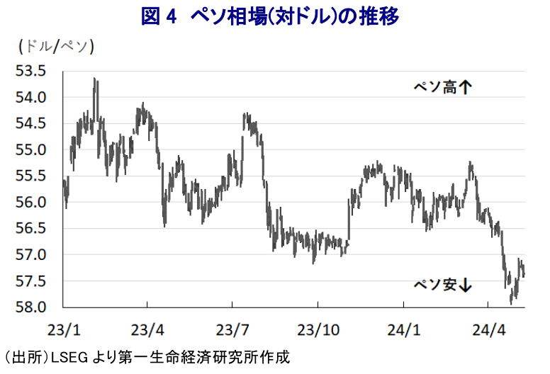 なお、上述のように昨年末以降のインフレは中銀目標の域内で推移するなど一見落ち着きを取り戻しているものの、足下では異常気象による供給不足を受けた食料インフレのほか、中東情勢の不透明感の高まりを受けた国際原油価格の底入れによりエネルギー価格も上昇するなど、生活必需品を中心にインフレ圧力が強まる動きがみられる。中銀はインフレが落ち着いた推移をみせていることを受けて、先月の定例会合において米FRB(連邦準備制度理事会)が年内にも利下げに動くとの見方を前提に将来的な利下げの可能性に含みを持たせる考えを示した(注2)。しかし、その後は米国のインフレの粘着度の高さがあらためて確認されるとともに、米FRBの政策運営に対する見方が変化するなかで国際金融市場では米ドル高の動きが再燃しており、ペソ相場は調整の動きを強める事態に直面している。こうした事態を受けて、中銀のレモロナ総裁はペソ安阻止に向けてあらゆる手段を排除しない姿勢をみせる一方、政策委員のひとりであるレクト財務相は通貨防衛を目的とする利上げ実施に反対する姿勢を示すなど、政策運営を巡って難しい状況に直面している様子がうかがえる(注3)。同国は穀物をはじめとする食料品のほか、原油をはじめとするエネルギー資源もともに海外からの輸入に依存しており、折からの価格上昇がインフレ圧力を招くなかでペソ安は輸入インフレを通じてインフレ圧力を一段と増幅させることが懸念される。他方、上述のように足下の景気は堅調さが確認されたものの、先行きは世界経済の減速が外需の足かせになることに加え、移民送金の低迷や生活必需品を中心とするインフレが内需の重石となり得るなど内・外需双方に不透明要因が山積するなか、中銀にとっては景気に一段の冷や水を浴びせる利上げに及び腰となることは間違いない。1-3月のGDP統計を受けて政府は今年の経済成長率の政府目標(6~7%)の達成は可能との見方を維持しているが、現実にはハードルが高いと見込まれる一方、先行きはこうした政府の見方が中銀に対する『暗黙の圧力』となる可能性に注意する必要性があると判断できる。